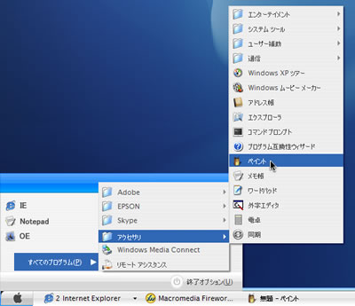 ペイントは、上のようにWindowsの「スタートメニュー」>「全てのプログラム」>「アクセサリ」の中にあります。