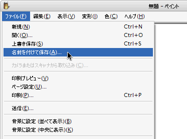 ペイントのメニューから「ファイル」>「名前を付けて保存」を選択します。