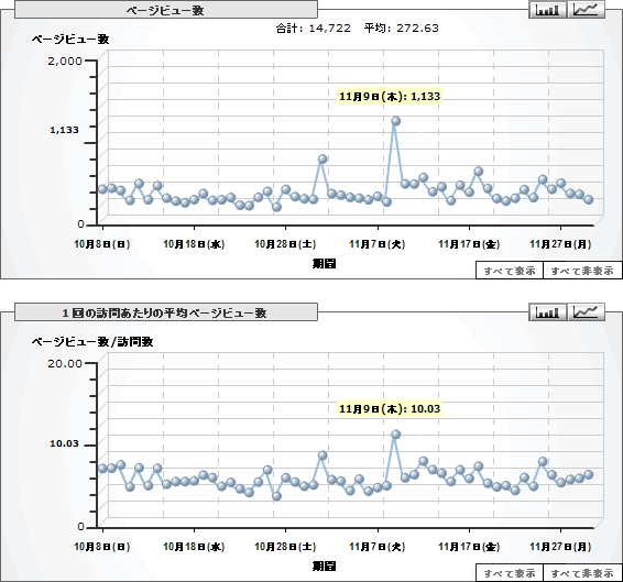 上のグラフは全ページを合計し何ページが見られたかをあらわします。11月9日は1133ページが閲覧されています。