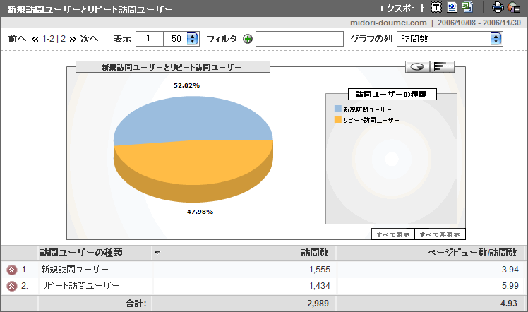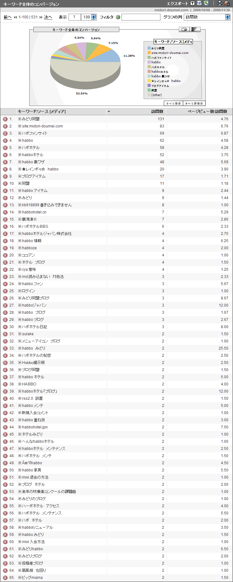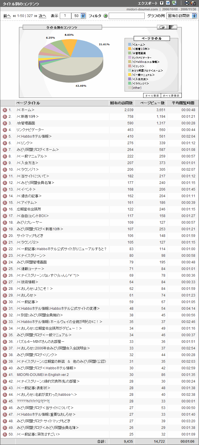 どんなページ(コンテンツ)が人気があるのかを人気順に50位まで表示しています。リストでは、訪問者数とページを見た回数(同じ人がもう一度見た場合もカウントされますので訪問数より多いです)とそれぞれのページの平均閲覧時間が表示されています。