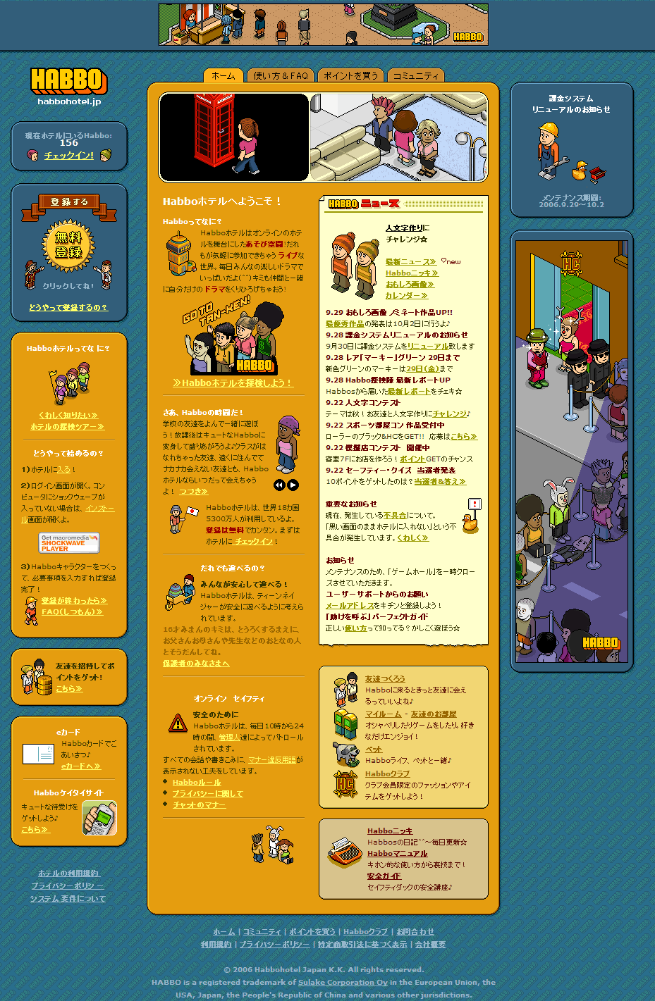 日本のHabboホテル公式サイトは2006年11/18現在は2005年バージョンなので、いまさら2006年バージョンに変わってももうすぐ2007年